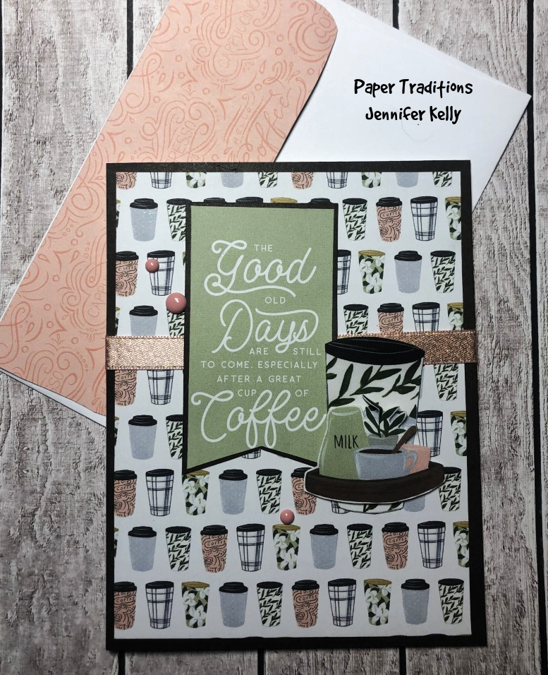 I have taken BIG artistic license with this sketch, while keeping the elements as designed. OK ready....Sometimes all you need for an awesome card is a great paper pack. This one is from Echo Park and is called Coffee & Friends. The sentiment sure spoke to me - "The good ole days ae still to come, especially with a great cup of coffee" In my head I added "especially with friends & family."I kept the sketch in mind with the three elements together (I know only one is a banner) and the sentiment on the paper tag. I also added blush ribbon (retired CTMH) from my stash and a few peach enamel dots.